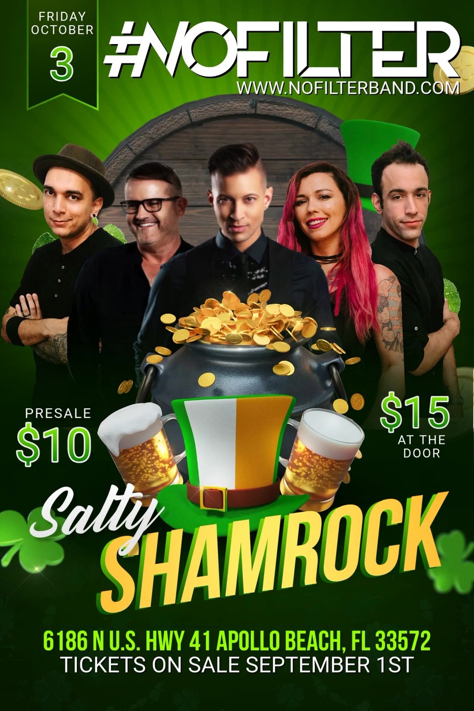It’s hard to believe Salty Shamrock is celebrating 10 years and Apollo Beach. We are so excited to celebrate this for such a wonderful community come out for five days of fun and the best entertainment all year long Friday through Sunday to five dollar entry fee or $10 get you all three days. St. Patrick’s Day is $10 at the door will come in on Patty’s Day eve Monday and purchase your band for five dollars at a discounted price check out the lineup. This is the best you’ll see in the area.